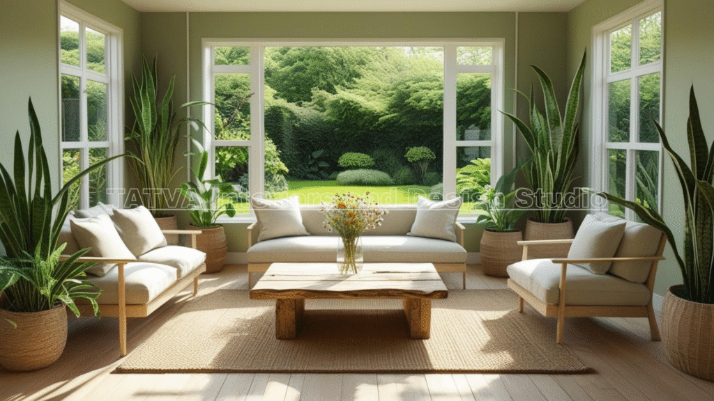 Nature-Inspired interiors blend biophilic design with natural materials, creating a space that feels grounded, fresh, and soothing. This style reflects a deep connection with the outdoors, prioritizing natural light, indoor plants, raw textures, and earthy color palettes.